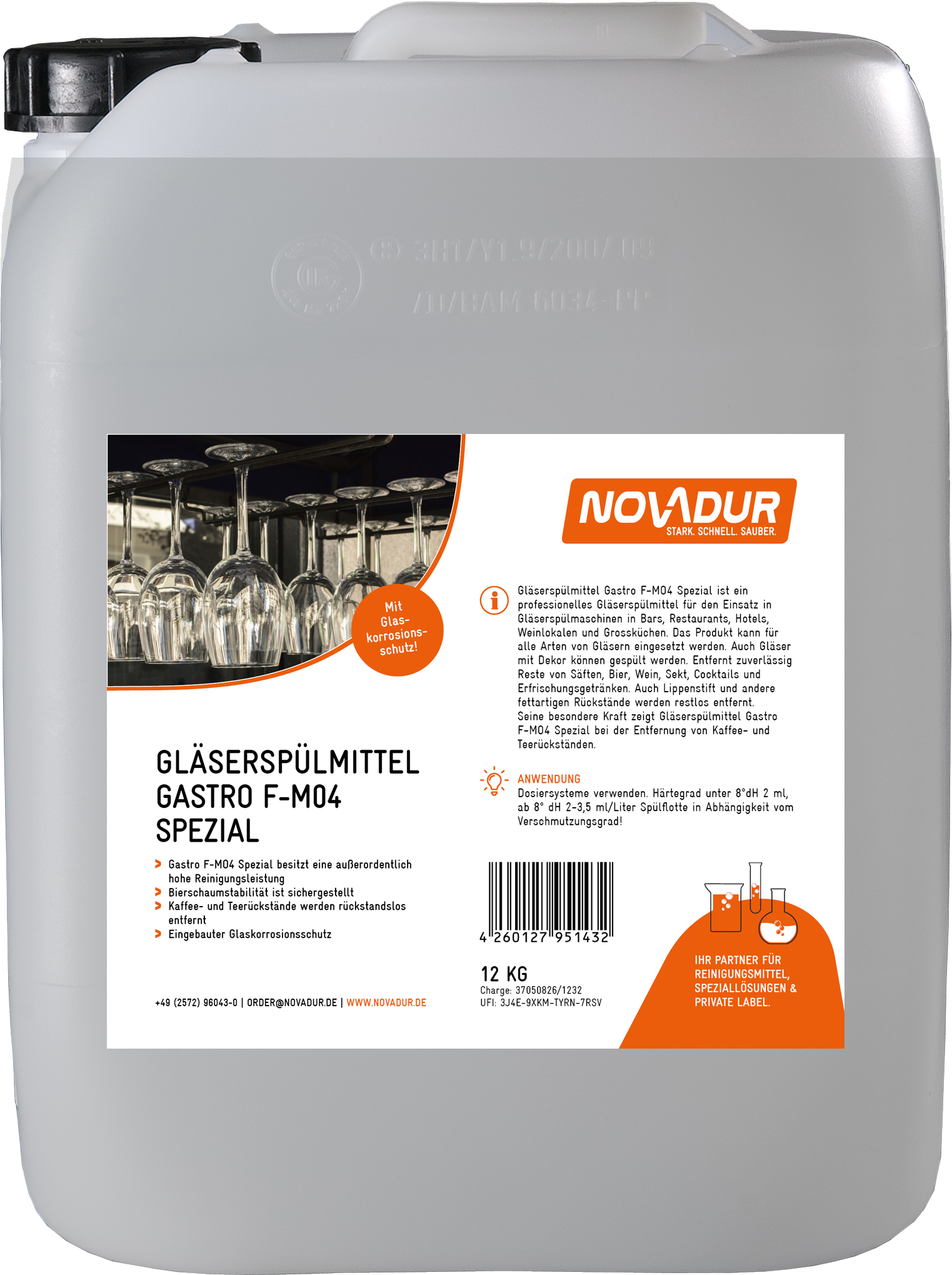 für den Einsatz in Gläserspülmaschinen in Bars, Restaurants, Hotels, Weinlokalen und Großküchen. Das Produkt kann für alle Arten von Gläsern eingesetzt werden. Auch Gläser mit Dekor können gespült werden. Entfernt zuverlässig Reste von Säften, Bier, Wein, Sekt, Cocktails und Erfrischungsgetränken. Auch Lippenstift und andere fettartigen Rückstände werden restlos entfernt. Seine besondere Kraft zeigt Gläserspülmittel F-M04 Spezial bei der Entfernung von Kaffee- und Teerückständen.