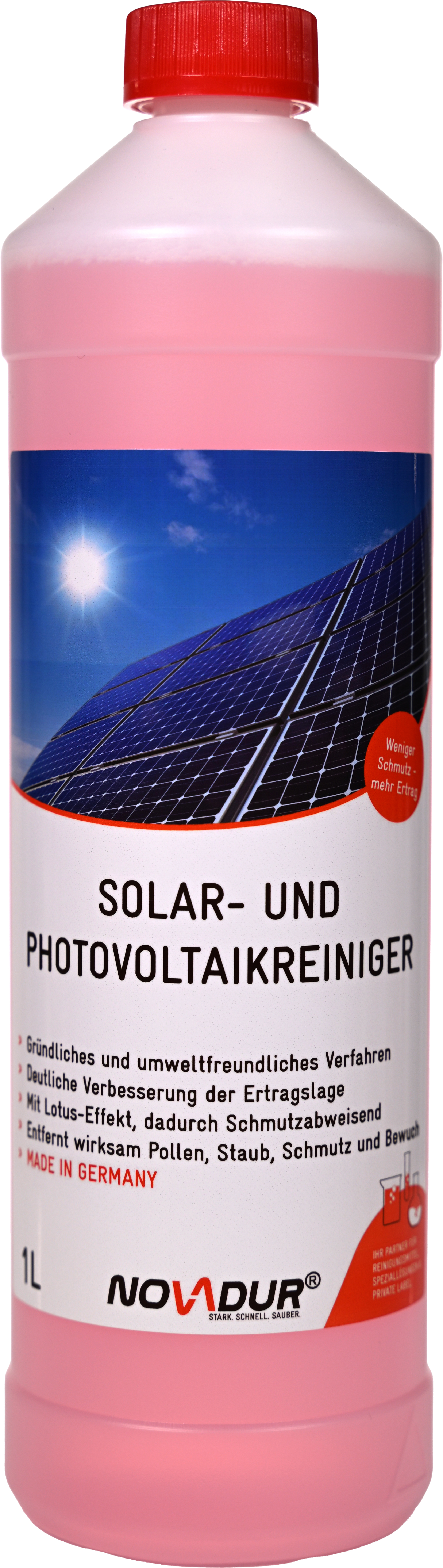 Solar- und Photovoltaikreiniger ist speziell für die Reinigung von Photovoltaikanlagen entwickelt worden. Regelmäßige Pflege erhöhen den Ertrag/Jahr deutlich. Dabei können Sie mit Solar- und Photovoltaikreiniger absolut umweltfreundlich und äußerst sparsam reinigen. Ein eingebauter Lotus-Effekt sorgt für ein rasches Ablaufen von Wasser und verhindert ein schnelles Wiederanschmutzen.